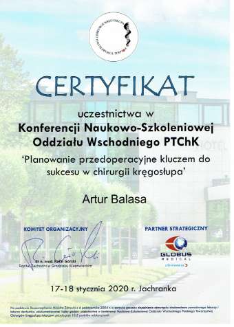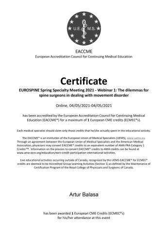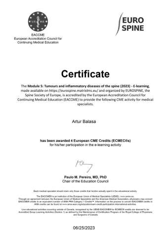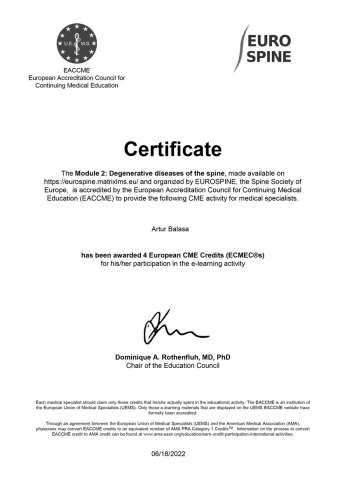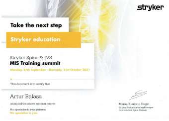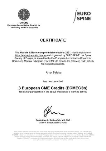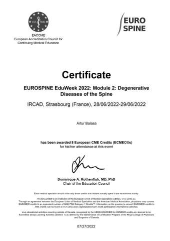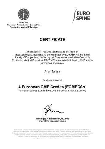 W ramach mojego członkostwa w Eusopine, obecnie zdobywam oficjalny europejski dyplom z chirurgii kręgosłupa. To dla mnie niezwykle ważne, ponieważ dążę do poszerzenia wiedzy i umiejętności w tej dziedzinie, aby zapewnić Ci kompleksową opiekę.